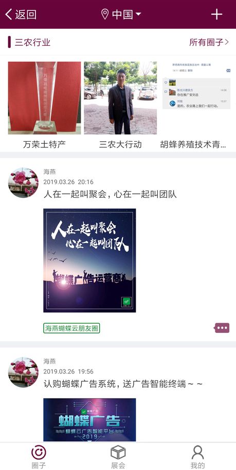 用户可以通过蝴蝶云APP来建立电子名片、云终端等来展示、推广自己与蝴蝶云全国十万以上精准用户区域集群、互动交流,举办商圈、展会。