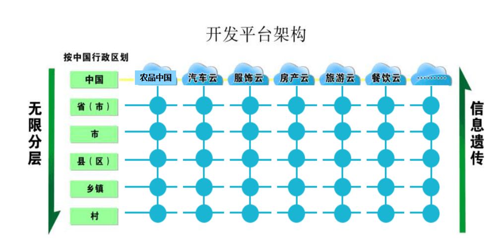 最基层的信息尤为重要,“鸿蒙云平台”用遗传的方式(即信息遗传技术)把乡村的信息显示在不同的大平台上面。即村级平台上发布的信息,会同时显示在乡镇、县、市、省、和中国的大平台上,这种由点到面的信息显示规则可使乡镇的农副食品和农产品可以在全国免费得到推广。