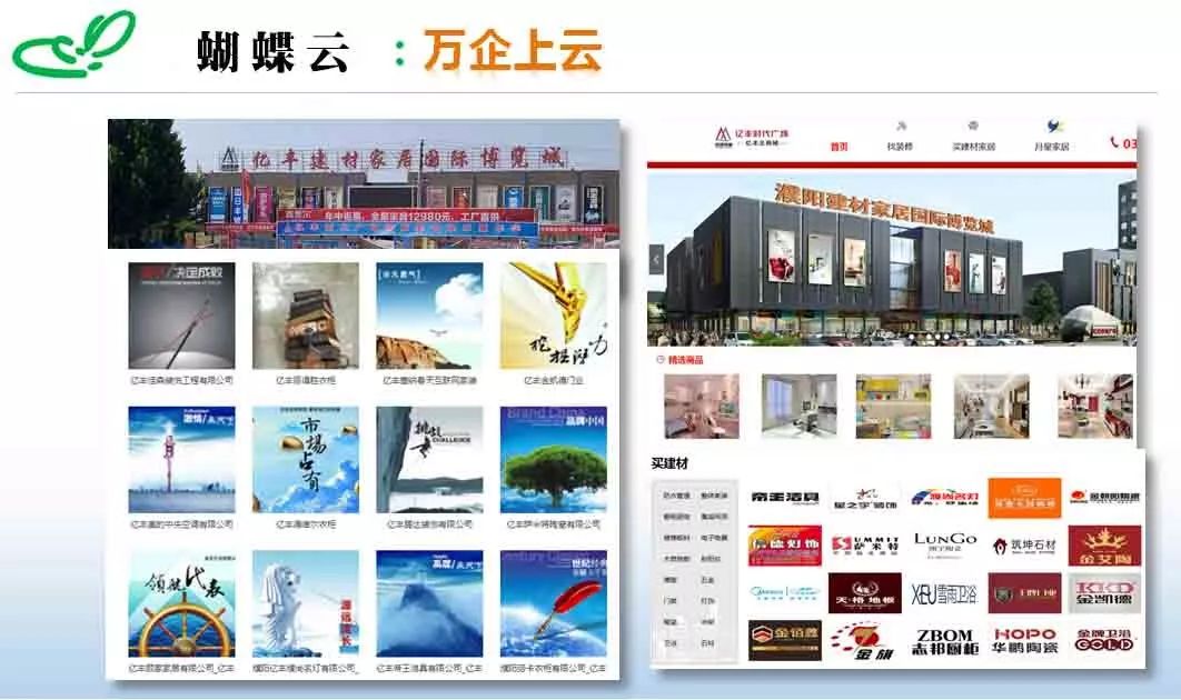 企业、集贸市场集体转型升级,集展示云网站、交易云网店、实体店铺相结合三位一体的终极电子商务新模式,商家平台展示,虚实结合、同城落地式各行业网络综合平台,开发与现实中的店铺外观形式非常类似的布局,达到一个真正可以逛”的网上商城,线上线下,虚实结合,并与乡村、社区构成新的购物场景。